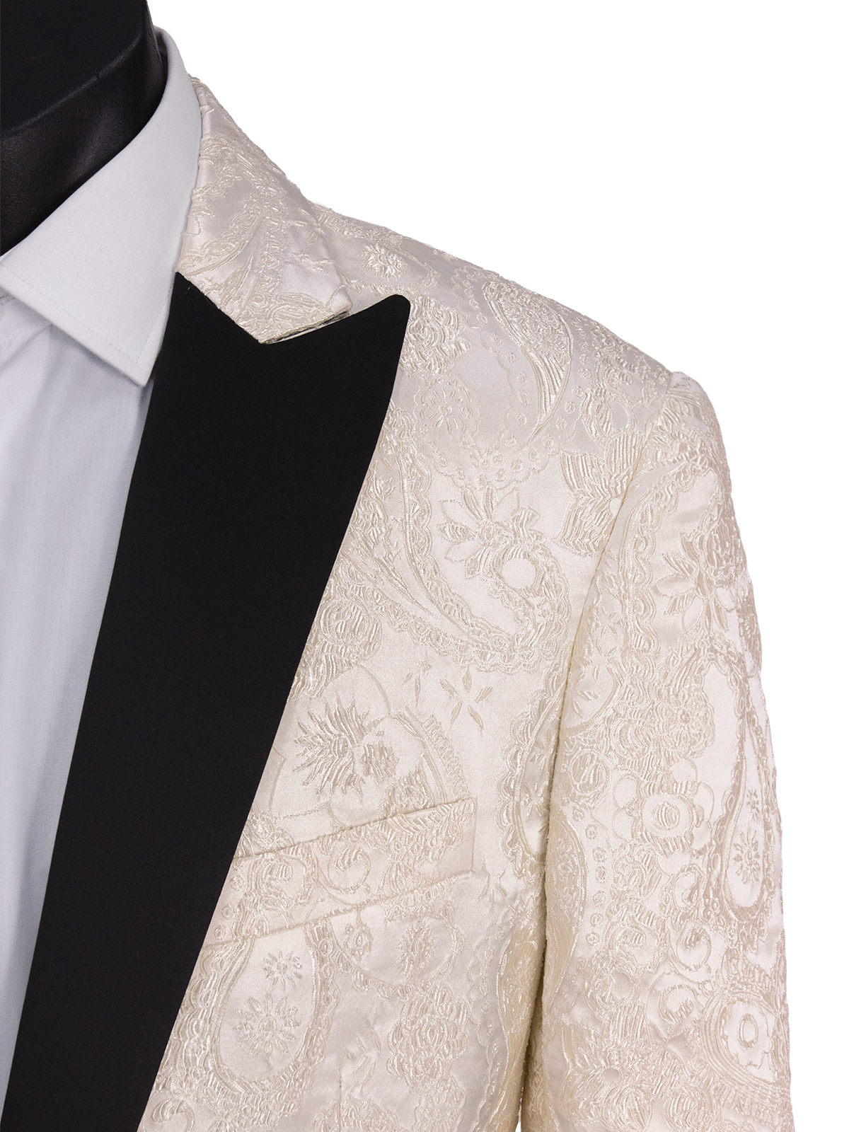 Expertly crafted in VARCE ITALIA's signature style, this Ivory Paisley Dinner Jacket features a stunning paisley design that is sure to make a statement. The sleek black lapel and one-button closure add a touch of sophistication, making it perfect for any formal occasion. Elevate your wardrobe with this luxurious piece.