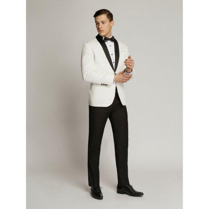 Introducing the Varce Italia White Dinner Jacket - the perfect choice for a sophisticated and classic look. Expertly tailored for a sleek and modern fit, this white tuxedo features a striking black shawl lapel and a single button closure for a touch of elegance. With side vents for comfort and breathability, this dinner jacket is a timeless addition to any wardrobe.